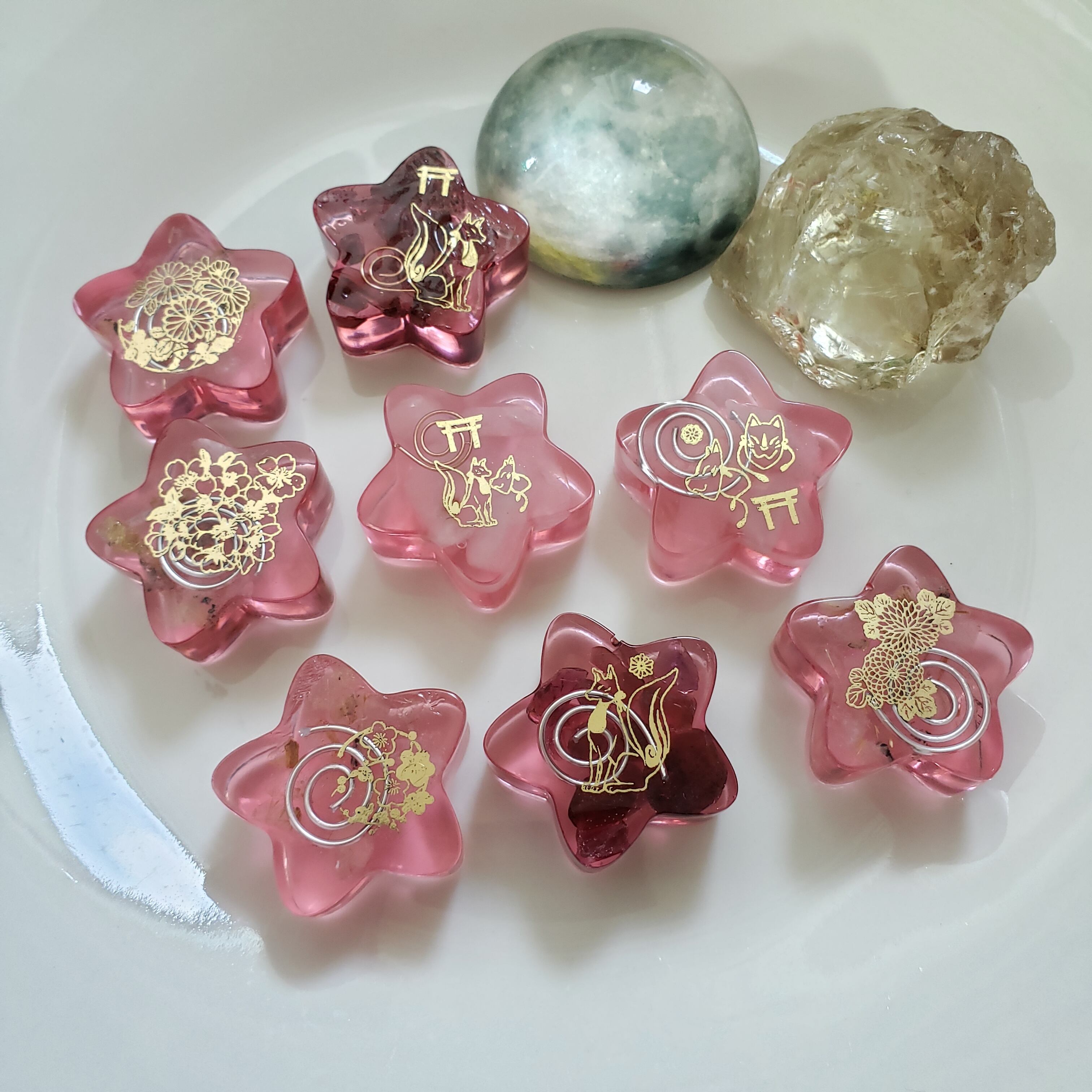 こちらは、スターローズクォーツ、ガーネット、ゴールデンルチルクォーツのプチオルゴナイトちゃんです✨