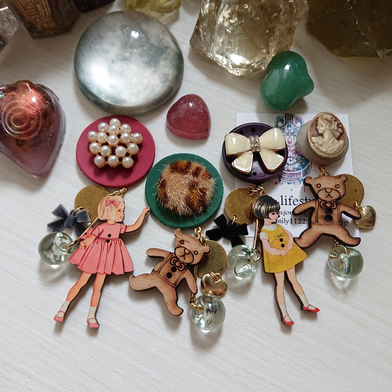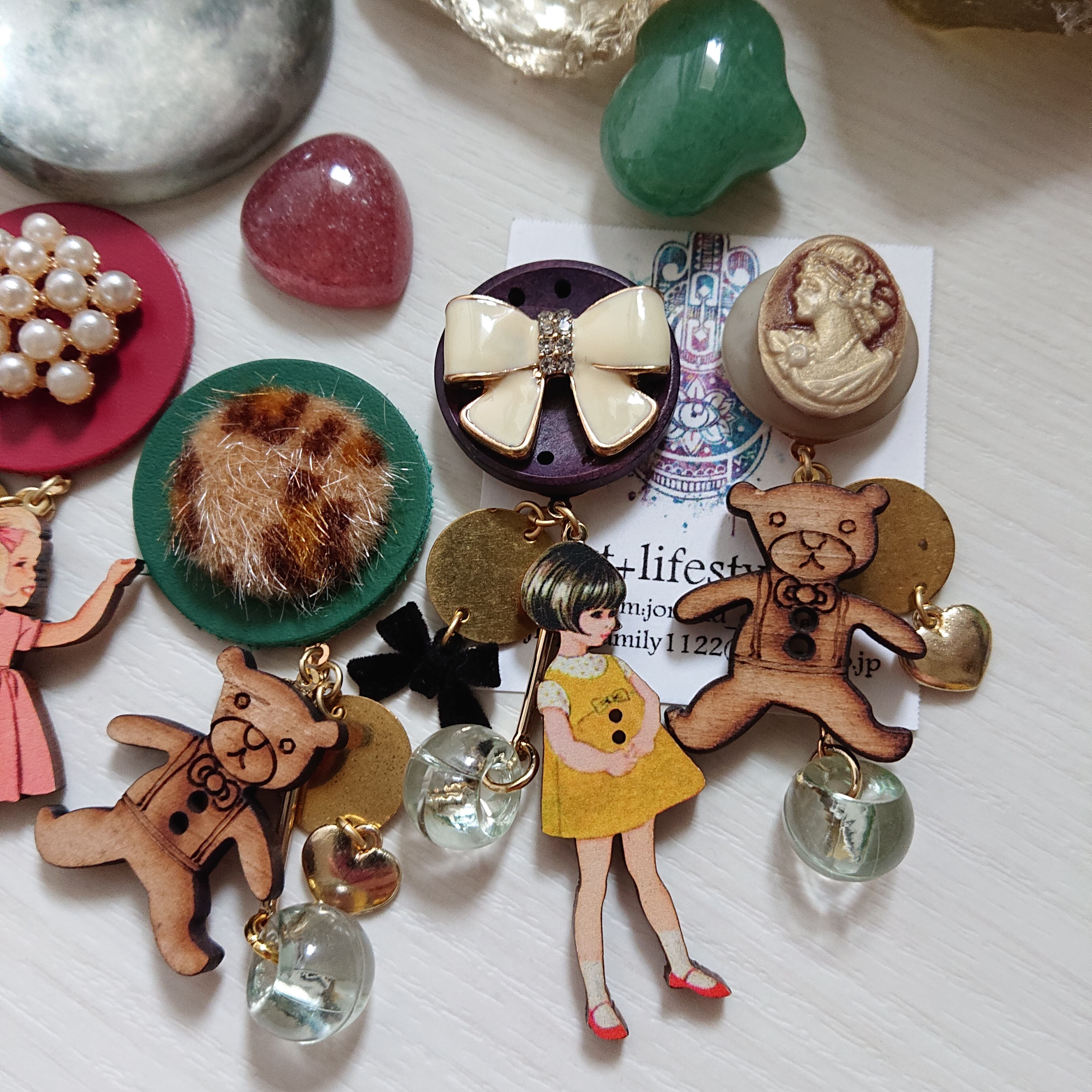 フランス製のウッドボタン、ボヌールちゃんと、オリジナルパーツを使った新作でございます。