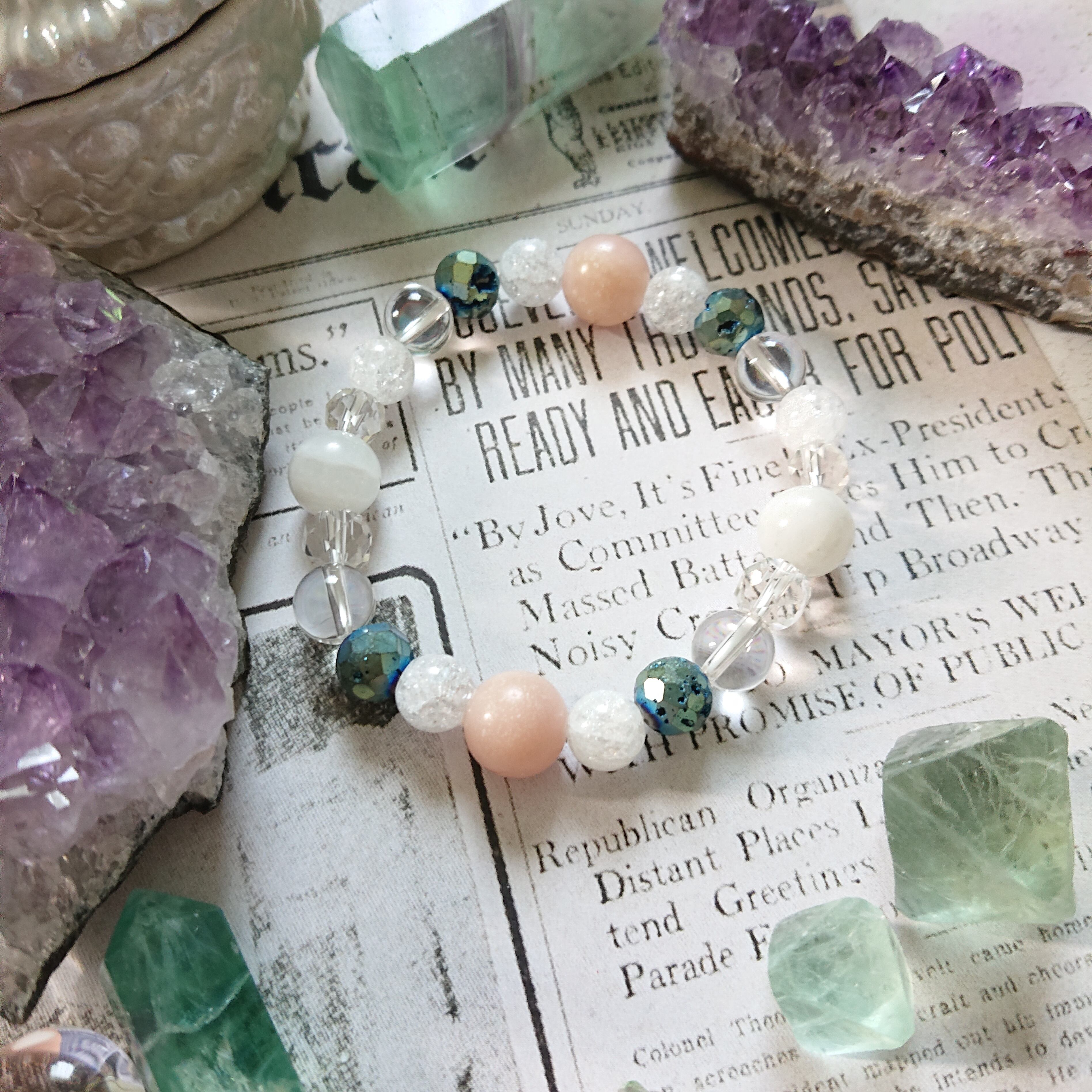 天然石:溶岩、山梨県産水晶、ムーンストーン、ピンクコーラル。