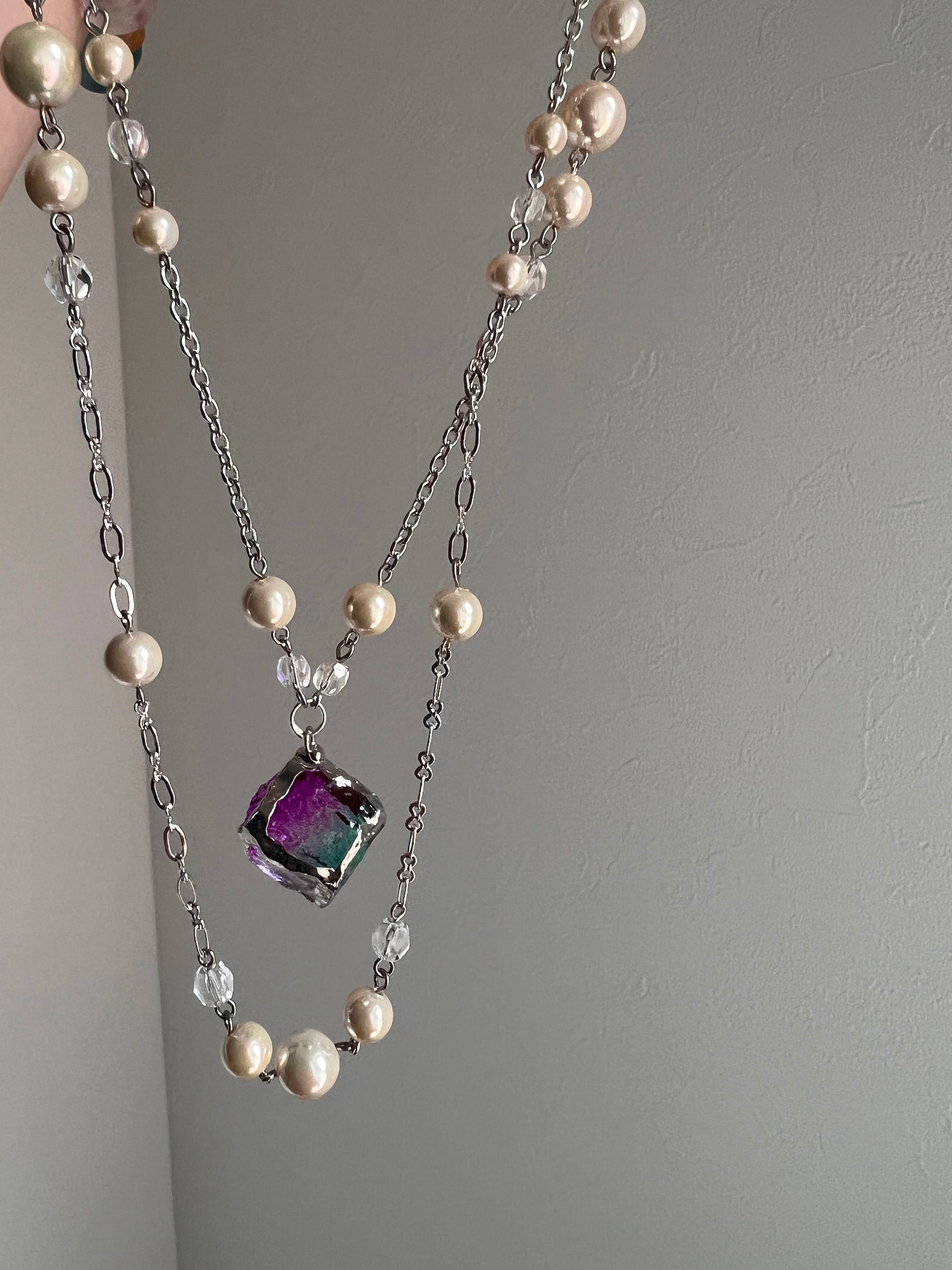 the cube.ネックレス 天然石 水晶 キューブ パール